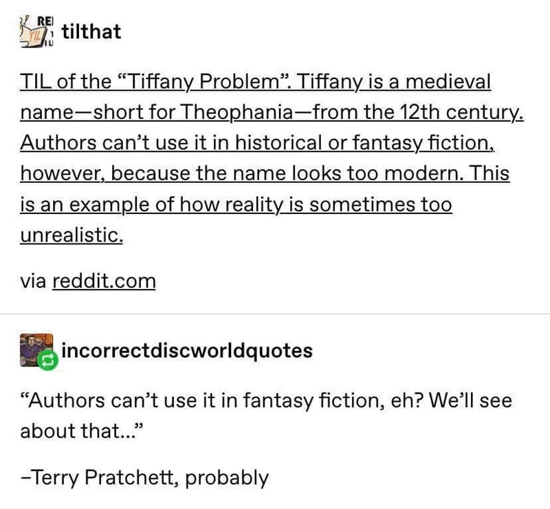 Tiffany là cách dân Anh phát âm cái tên Theophania, một cái tên gốc Hy Lạp thường được đặt cho các bé gái sinh ra gần lễ Theophany (Lễ Hiển Linh). Thế nên nếu có ai viết một cuốn truyện Epic Fantasy lấy bối cảnh Trung Cổ, họ hoàn toàn có thể đặt cho một nhân vật nào đó trong tác phẩm của mình cái tên Tiffany này.
