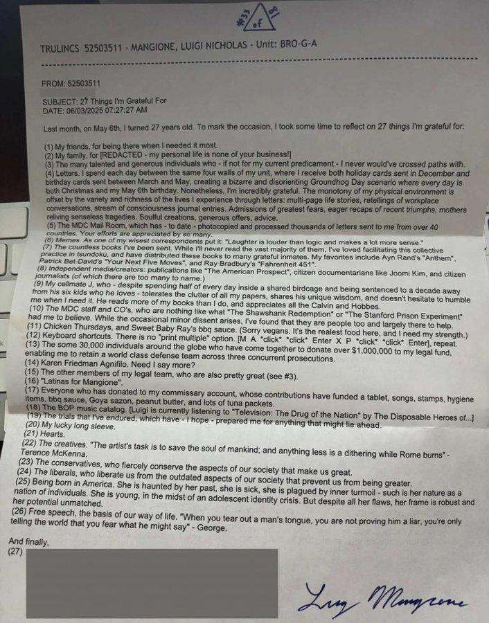 Nay mới vớ được cái ảnh này, chụp một cái thư mới viết nhân dịp sinh nhật của Luigi Mangione, tức thằng em 98 hồi cuối năm ngoái mới đòm một đồng chí CEO bảo hiểm. Đọc đến mục 7 thì thấy hóa ra thằng cu cũng là dân đọc Sci Fi, anh em ạ 🐧.